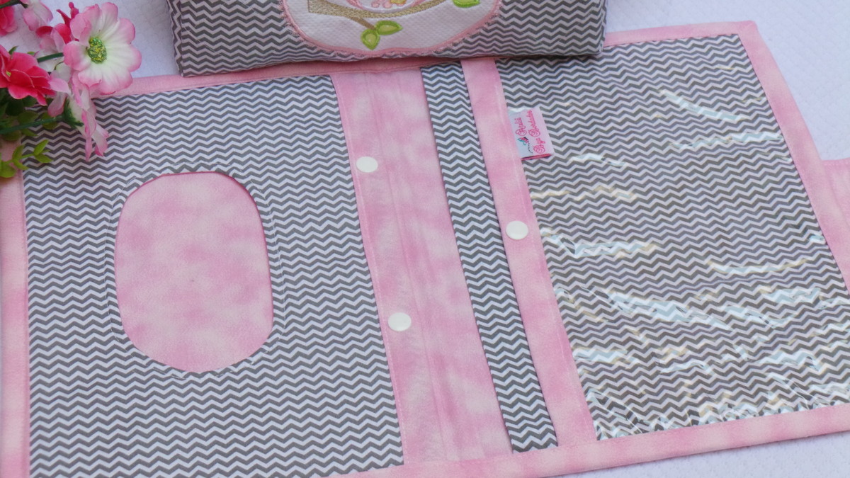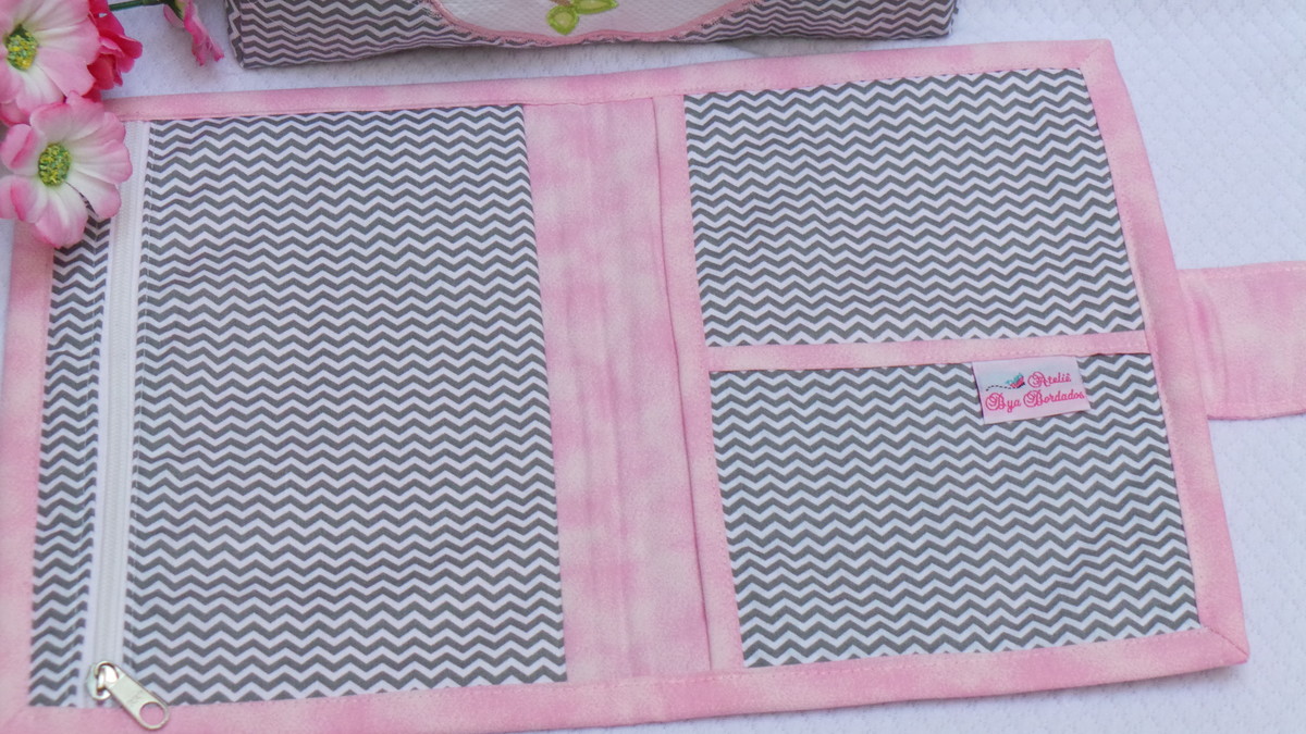 Kit Necessaire Baby box, Porta Fralda/ Lenço Umedecido / Pomada e Porta Cartão de Vacinas, feitos no tecido chevron cinza e tricoline rosa 100% algodão.